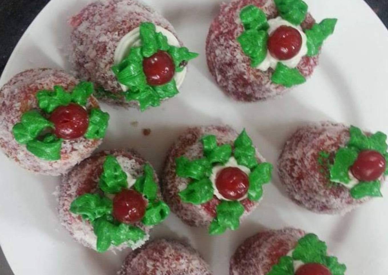 - With the help of whipped cream and green colour make leaves over them and place cherries betwwen that