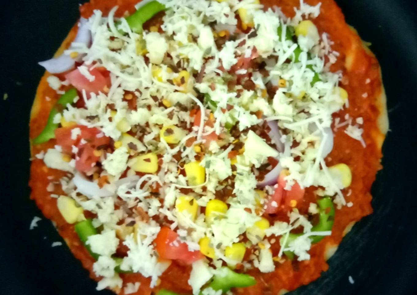 - Flip the Roti and spread pizza sauce on it.then add chopped veggies on it. Bake it on low flame